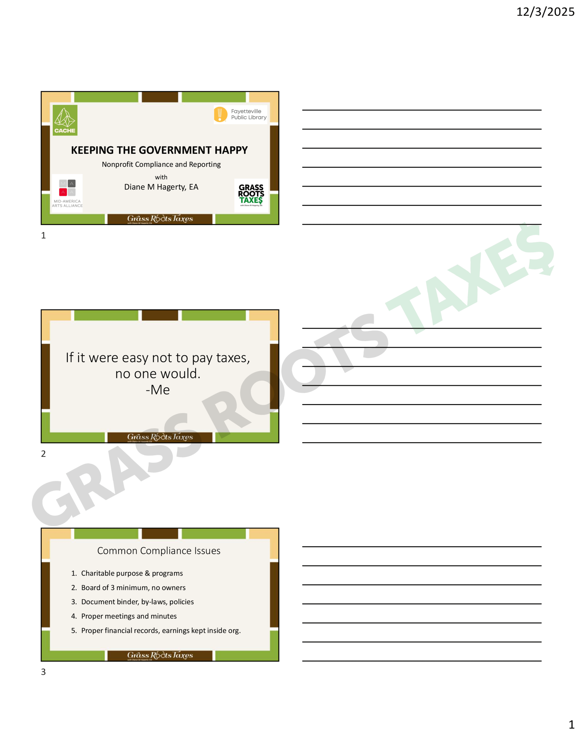Review the Grass Roots Taxes Non-Profit Compliance class slides and take notes. This product is just the slides. Check out our packet for more.